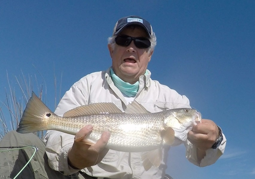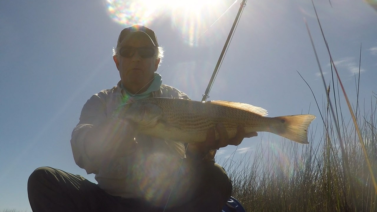 Roughly, 24 feet per second. Not a great day to push a kayak in the wind and sight cast to redfish. I must confess though, I had help. The wind had almost beaten me. I had all but given up and, having nothing better to do, I started eating my sandwich while tucked in a little creek in the marsh. Pelicans and seagulls started diving in another creek about 50 yards away. I watched them but couldn’t see what they were after and I didn’t see any fish activity. I almost just waded over there it was so close, but I figured I was out of options so I decided to do it right. I pushed around the point and over to them. It was a small but long marsh creek or bayou, whatever you would call it, only about 30 yards wide. Then I saw what was happening, a school of 8-10 redfish swam in chasing minnows. They caught me by surprise but I caught a small one off the back of the pack. After I released him I looked up, (the water was a clear as a bell) and another school was swimming by and I cast to the lead fish, the one in the top photo, and caught him. After that I followed the birds and when there weren’t any birds I just looked for similar looking creeks. The wind had the bait pushed up in the little creeks. I used a marabou clouser all day. Was fun but man was it a lot of work.