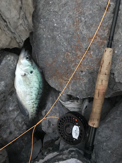 I had business in Ridgeland late yesterday and afterwards I took the opportunity to stop by Red Dot road which is a jetty with a road on it which protects the main harbor. There were a handful of trucks so I had no trouble finding a spot. I took up a spot before sundown and began casting a microjig using the Tongoriro roll cast to keep from snagging any of the many passers-by. I had no luck until after dark when this crappie grabbed my fly just a few feet off the rocks. I know others at the Rez have been catching fish and this fish shows that they are coming to the rocks. Fishing after dark is probably the most productive.