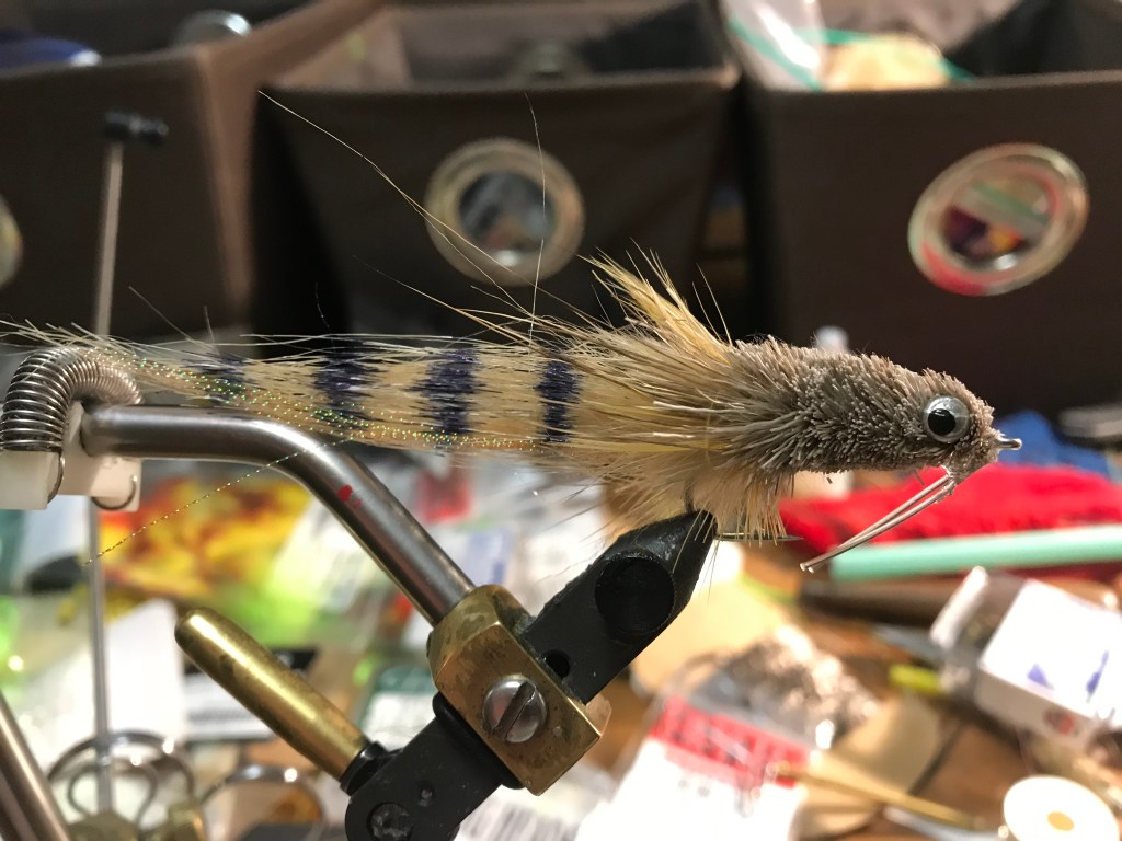 I never quite understood the Kwan fly because crabs don’t have a long tail. But there’s no question as to whether the fly works. I guess other folks didn’t understand that either and so other variations came on the scene. The Kwan Shrimp, Kwan Crab, Kwan Mullet all have the characteristic craft fur or EP tail with the bar markings.