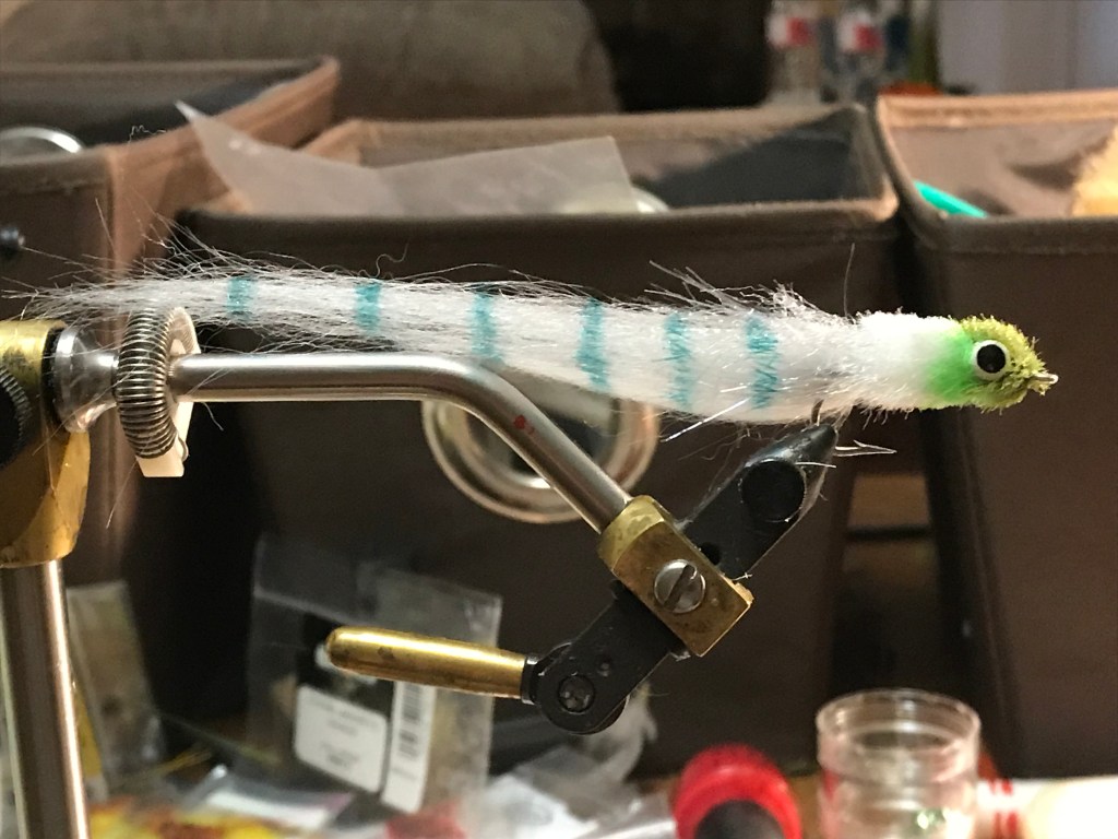 I chose to tie my first Kwan as a mullet because the long barred tail tends to make me think fish and when the big bulls are what you are after, the guides are telling you to go with big stuff and often, specifically, a big mullet imitation. The crabs get scarce in the winter but the mullet are always around.