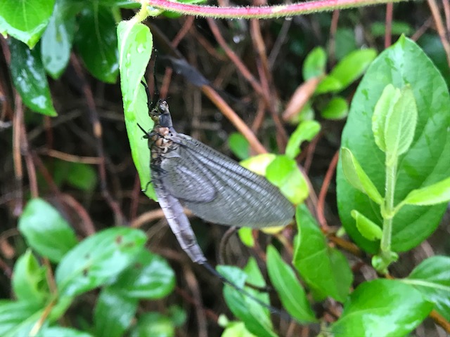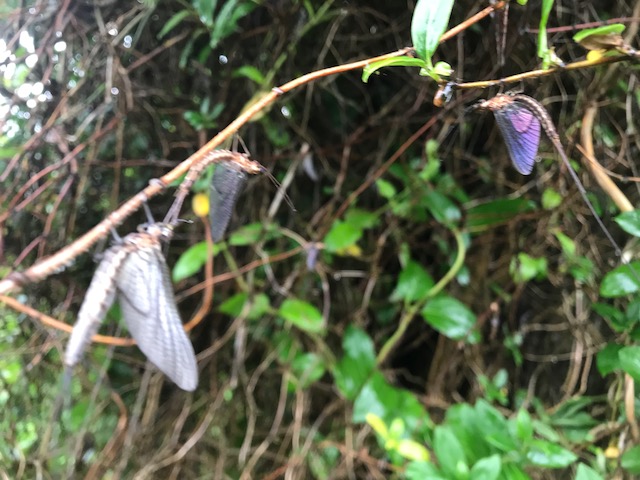 Last year as I began checking for mayflies I encountered a lot of smaller, brown mayflies in the grass. There would be a few in the trees but most were in the grass. At first I was excited, thinking that maybe they were early volunteers and maybe a hatch was coming, but unfortunately there were none on the following day. After some research I put two and two together and realized that they were males left over from a previous hatch. The males are smaller and after mating with one female they will continue to mate until all the females are spent. They have no digestive system and no mouth so they don’t live long but they can live long enough to be around the following day before they die of starvation or the birds finish them off. I then found out how to tell a male from a female by looking for the clasper appendages the male uses to cling to the female and the next time I found bugs in the grass, they were in fact all males. To anyone experiencing this, you are too late, and the fish do not hang around for very long after the spinner fall. Another indication that you are too late is if you encounter a heavy decomposition smell.
