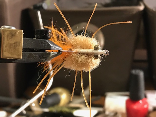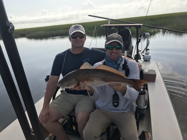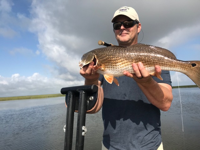 With no luck on jacks or early morning drums our guide took us into a duck pond with a lot of Coontail and Millfoil weed. Though the plant life had cleaned the water up some we still had mostly dirty water, but, when we did find pockets of clear water we usually saw redfish. I changed to a bead chain crab with the thought that a lighter fly might be easier to keep clean by keeping it shallow and not letting it fall into the vegetation. It worked well and I was able to keep the fly fairly clean. The two fish below were the result, one for each of us. Unfortunately the rain moved in and we had to bug out, but we had booked only a half day anyway.