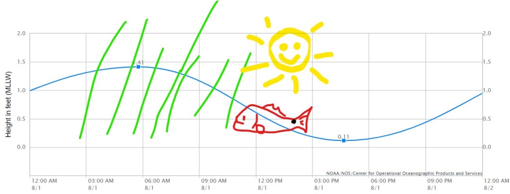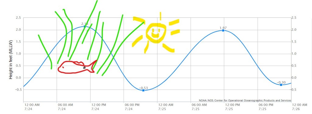 For example, say I would like to go fishing this weekend. Well here is what the tide looks like for July 24. In the following graph I drew my little crayon redfish down in the grass with a lot of water over his head in the prime fishing hours between 8 and 10. Obviously its gonna be hard to see him as deep as he is and plus he’s up in the grass anyway.