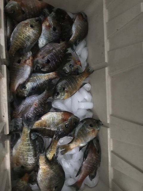 It is my understanding there has never been an alligator attack at the Rez, but wading out toward this big joker just didn’t seem like a great idea. He was standing his ground and my name is not Amos Moses. Fishing from the safety of the rocks I managed to catch quite a few just roll casting, but Mr. Gator just wouldn’t leave. Well, the thing about the mayflies at the Rez is they occur in more than one place so I just found another spot without a big gator in it. I wound up with the following cooler of bream. I kept probably kept only one out of five due to size. The reservoir bream are just generally not very big, unfortunately. Not like the gators.