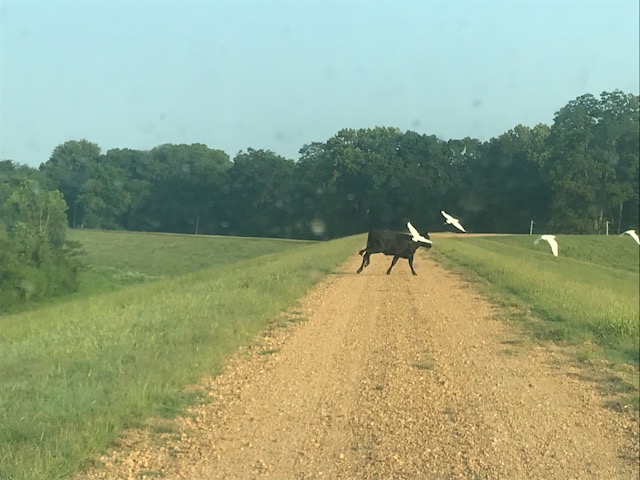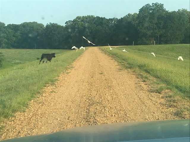 Well the attendance was light. It was me and Steve. The good news is the registration lines were short. We were about 30 minutes late leaving for the river but we were driving in on the levee by 7:30. As per usual some cows were standing in the road on top of the levee with cowbirds all around: