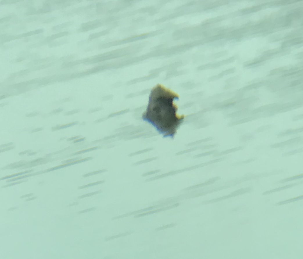 And so time goes by and I’m out casting again one day and, there it is. Same thing happens, I slip in, get the scope, return and it’s gone, but I did take a pic with my phone (below). Well the phone is no spotting scope but at least I can show my coworkers this dark object out in the lake so they know where to look for it. And… I knew they would look for it because once you hear about a monster you just can’t not look for it…