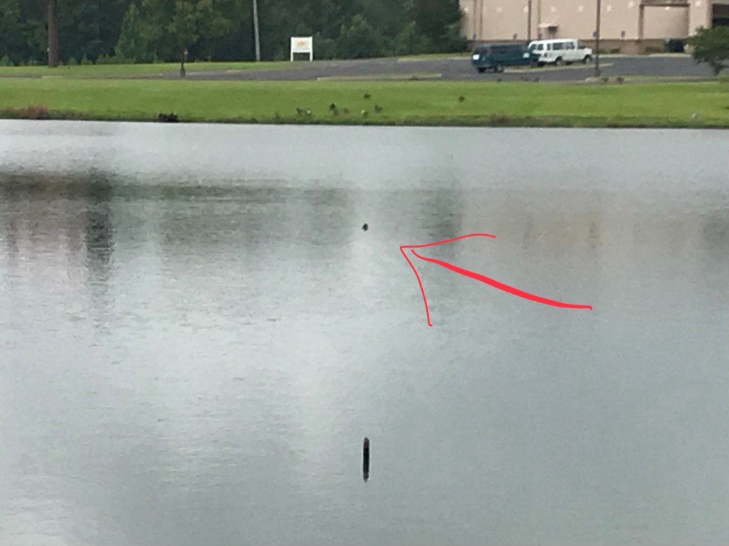 Nessie first appeared to me as I was practicing my fly casting out on the office lake. So I’m casting and enjoying it and then I see this stump in the lake where I’ve never seen one. I stopped casting and studied it for a minute. I thought then that maybe it was an animal but there was no movement, no ripples in the water, and the object was large for an animal’s head. I’m accustomed to seeing thumb sized turtle heads around the lake and only a few weeks ago a man and his children came by with a large turtle and put it in the lake. That turtle occupied most of a five gallon bucket, but I saw that turtle’s head and this was bigger, MUCH bigger. Its like the size of a Big Gulp cup, the one with the handle.