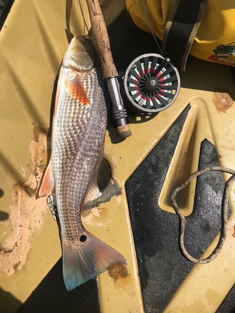 Had a great time, should have had six in the boat rather than just two. Had two rejections where the fish took the fly and just blew it back out before I could set the hook (I changed flies), two where I cast the fly too close and spooked the fish. I had several other opportunities where I saw fish but the fish got spooked by the boat or was just nervous and wouldn’t cooperate. All of that is just as much fun as catching them when you’re sight casting. My tidal calculations were perfect, the water was dirty but when it got shallow on the shelves I could see them, although it was hard. There were lots of shrimp, baitfish and crabs and the redfish were crashing them. That’s how I found all my fish, heard them crashing and just went and found them.