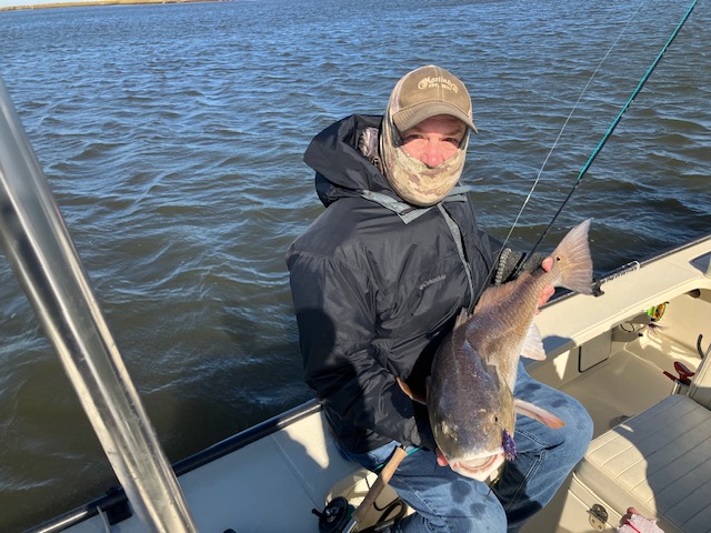 Our second day of fishing started out dismally with even higher winds and colder weather and a long lull of looking for bulls and not finding any. After a couple of hours though, Miles found the fish and my buddy caught yet another bull, putting him solidly two bull redfish ahead of me.