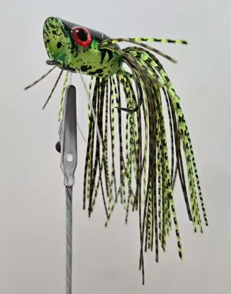 On the website the frog is described as “tied on a number 2 hook and has weed guards as an additional feature. There are 22 strands of two inch long green and black rubber for each rubber leg giving the popper lots of action in the water. If you are chasing big bass this one will catch them. Made in the USA by Pultz Poppers.”