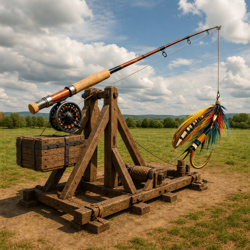For effect, I asked ChatGPT to draw a cartoon of a trebuchet with a fly rod as the throwing arm.
