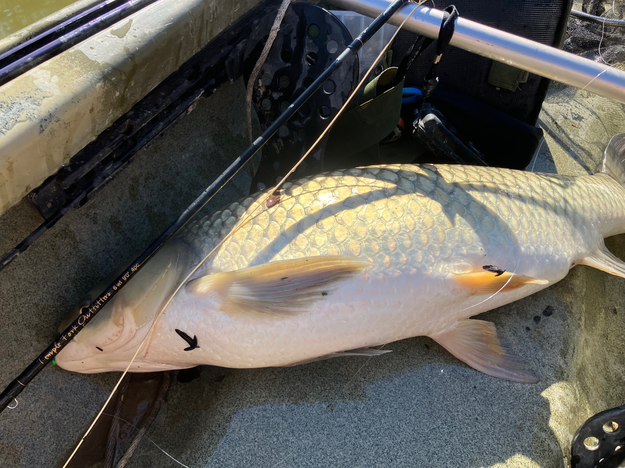 What a fight! I was in my kayak and I just had a tether on my paddled staked in the mud to hold me in one spot. The big grass carp had me doing circles around the paddle. I finally got him in and with no net I just had to scoop him up in my arms and drop him in the boat.